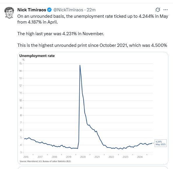 格隆汇6月6日|“美联储传声筒”NickTimiraos发文称,从未经四舍五入的数据看,5月的失业率从4月份的4.187%上升至4.244%。去年失业率的最高值出现在2024年11月按日配资炒股,为4.231%。可以说按日配资炒股,美国5月失业率是自2021年10月(当时为4.500%)以来的最高水平(未经四舍五入)。
