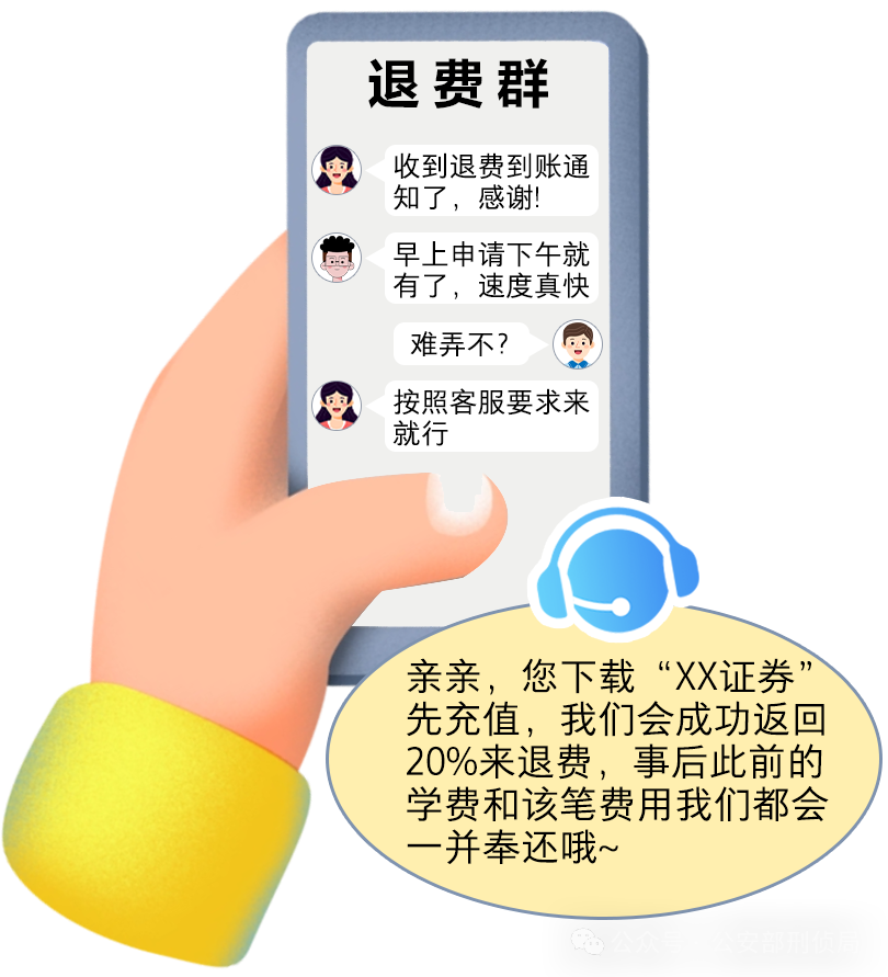 二是骗取信任。诈骗分子在社交群、聊天界面安排“托儿”发布“已收到退款”的虚假截图和聊天记录,编造“多人成功退费”信息,吸引事主。