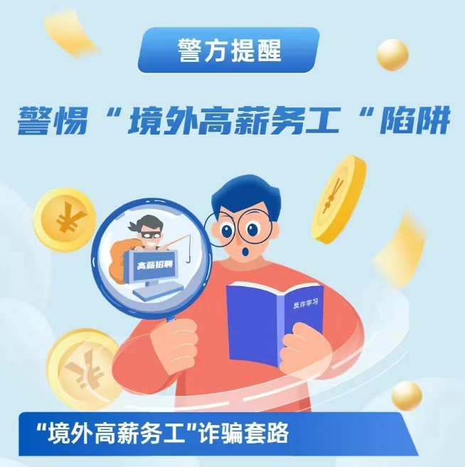 据有关部门通报,近日全国多地连续发生多起高中生和大学生外出打工失联事件。公安机关提醒,境外诈骗集团常以“高薪工作、包吃包住、报销机票、专人接送”为诱饵,或以商务考察、免费旅游等名义将境内人员诱骗至境外,从事电信网络诈骗等违法犯罪活动。请广大群众务必提高警惕,加强自身安全防范,切勿轻信境外高薪招聘信息,避免陷入骗局和电诈陷阱。